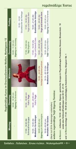 Mittwoch - - 19:00 - 22:00 Uhr Vorträge im Drachenzentrum 19:15 - 20:15 Uhr Meditation für Anfänger in Nossen: mittwochs 18:30 - 20:00 Uhr Qigong - gemischte Gruppe in Physiotherapie Porstmann; Nossen; Bismarckstr. 18